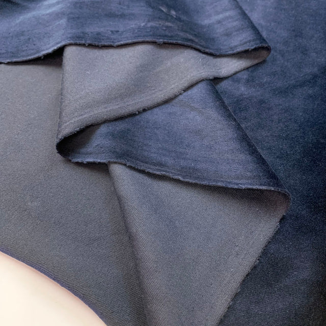 Bold dark blue velour fabric is beautifully dark and soft to the touch. Hanging beautifully and recovering well, this cloth is the perfect choice for children’s and adults loungewear - transitioning well from the sofa to the supermarkets!