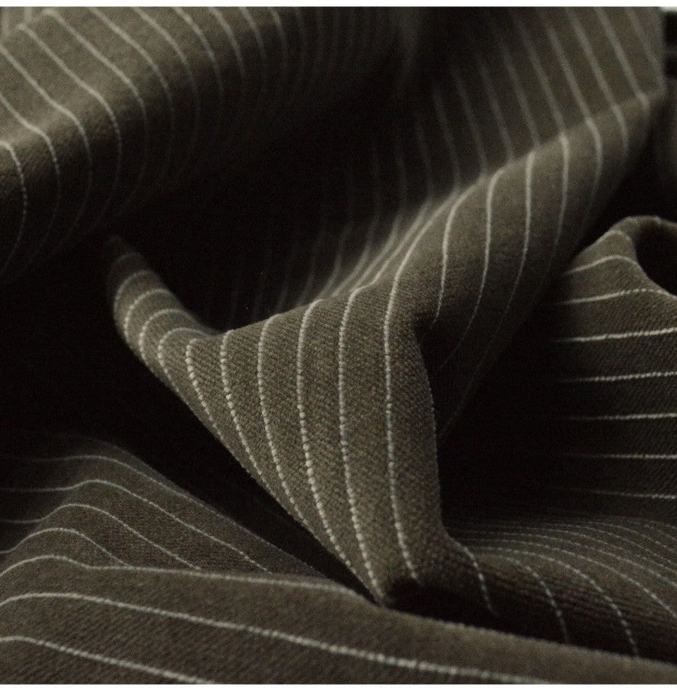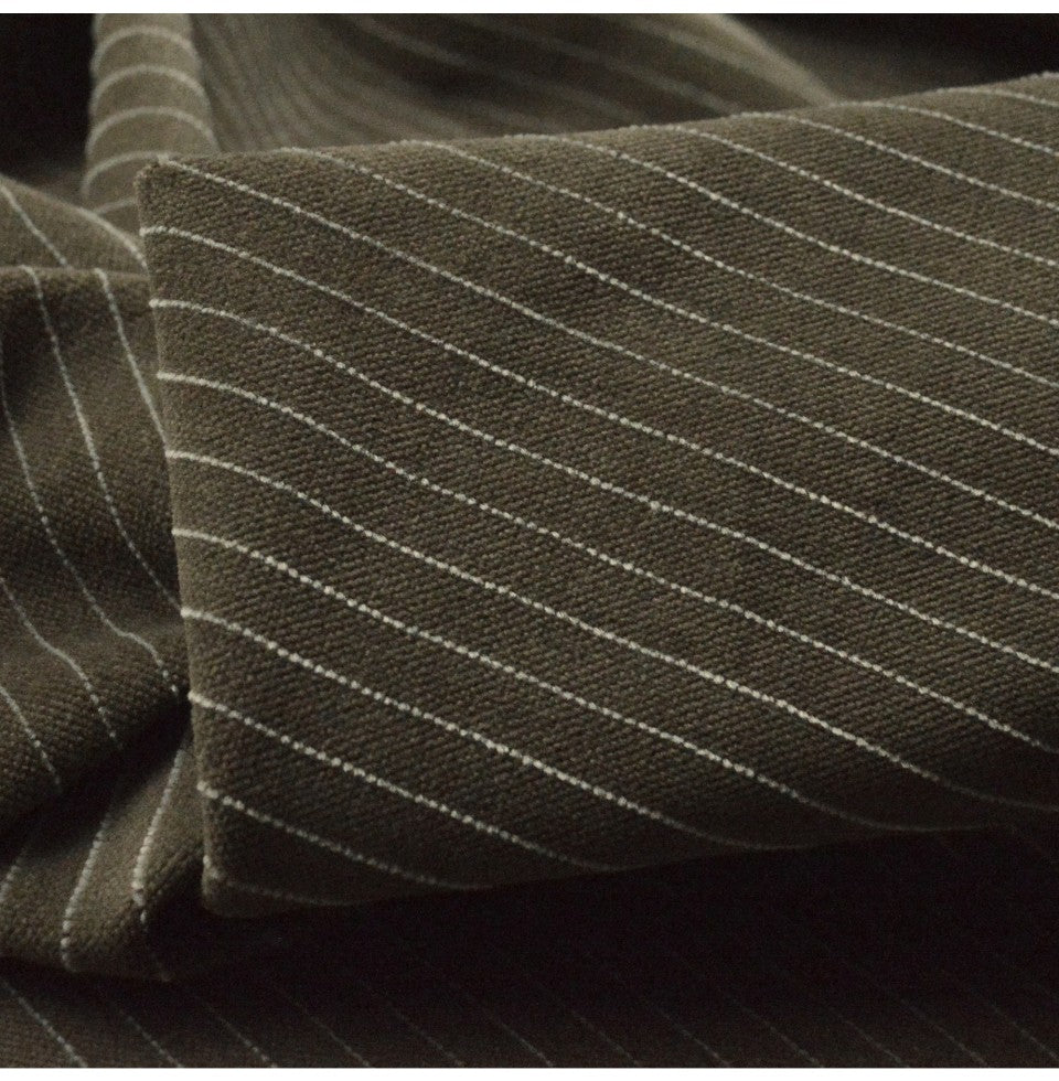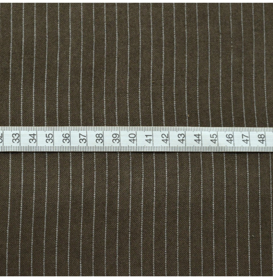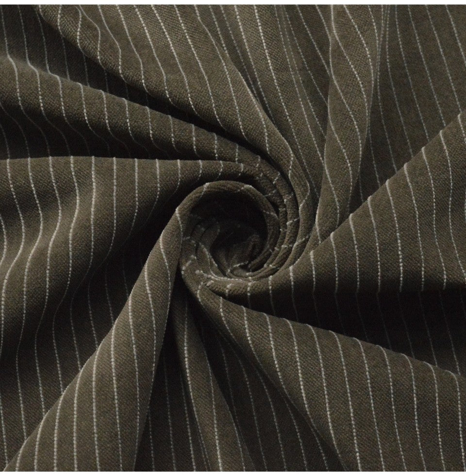 | 145cm wide cotton velveteen in pale mushroom with a fine white pinstripe at 7.5mm intervals, plenty of yarn in this allows for a fine weave and fairly light cutting to give the velveteen surface which is extremely comfortable. | |