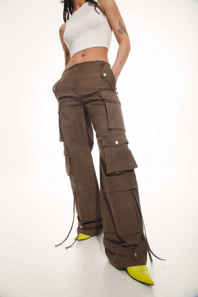 Blythe is a pair of semi-fitted trousers with a straight silhouette and a dropped waistline finished with raw edge bias binding. The front features three soft tucks along the inside and outside knee seams, slash pockets with flaps at the top, and patch pockets with zippers and long tie closures at the bottom.