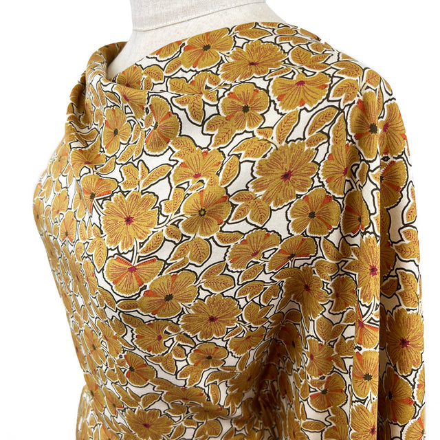 This simply gorgeous floral print viscose challis is truly wonderful to touch. We really wish you could reach through and feel this super soft and supple fabric because we're sure you'd fall in love as much as we have. Its floral design showcases golden brown, orange, red and beige hues.