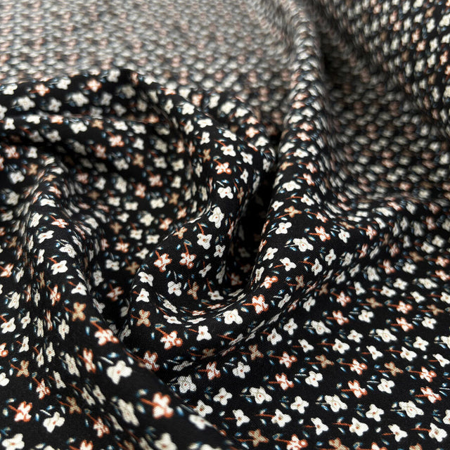 A beautifully soft and lightweight 100% viscose challis fabric in black, featuring an all-over ditsy floral print in warm, earthy tones.
