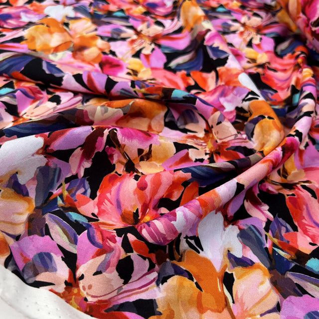 • Rich floral print in vibrant pinks, yellows, purples, greens, and reds against a black backdrop.
