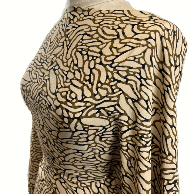 Our viscose challis dressmaking fabric features what we call a ‘pebble mosaic’ in brown, ideal for tops or trousers!