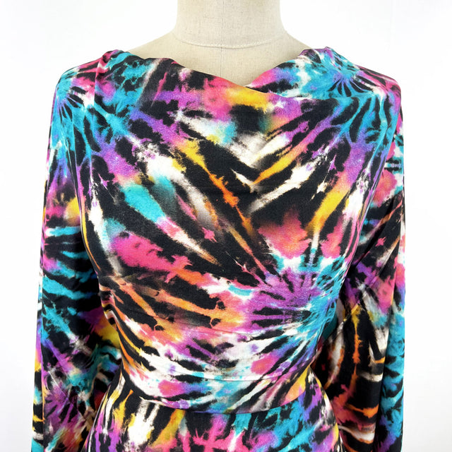 This beautiful high-quality digitally printed viscose dress fabric featuring a tie-dye design in purple, pink, blue, orange, white and black - very psychedelic!