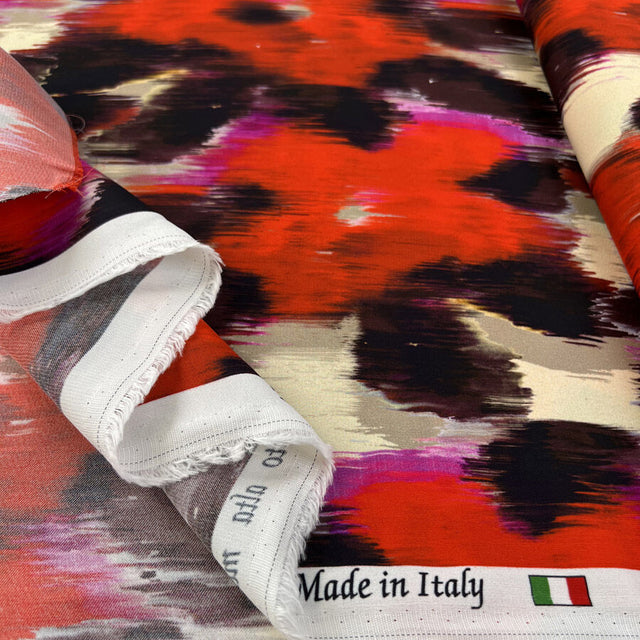 This Italian-made fabric is a lightweight viscose featuring a striking abstract design in fiery red, black, cream, and flashes of magenta. The painterly effect creates a bold, artistic look, perfect for statement garments.