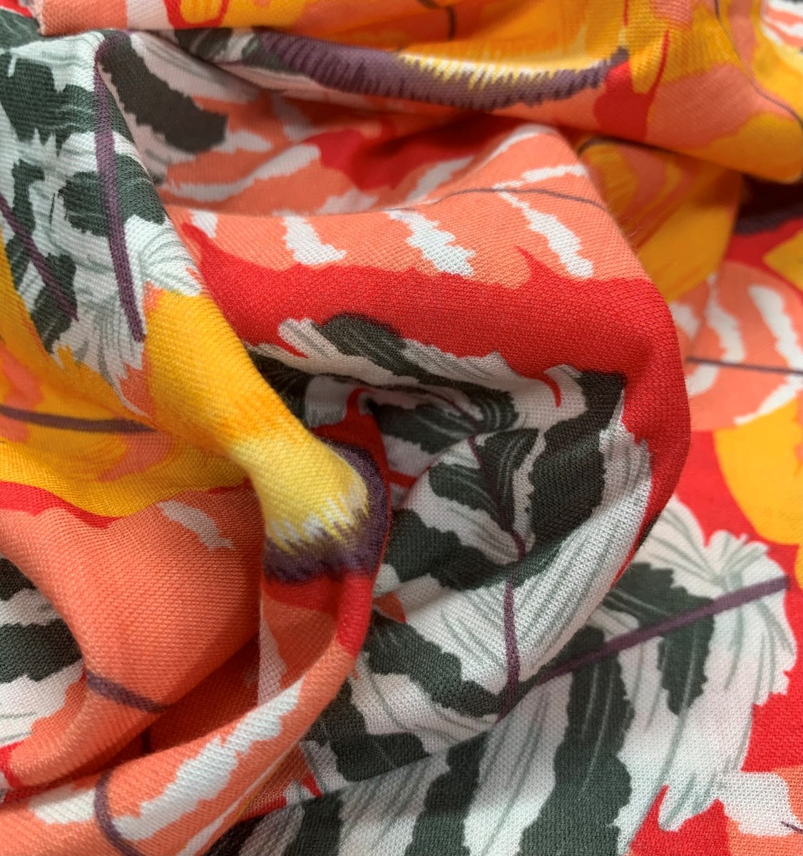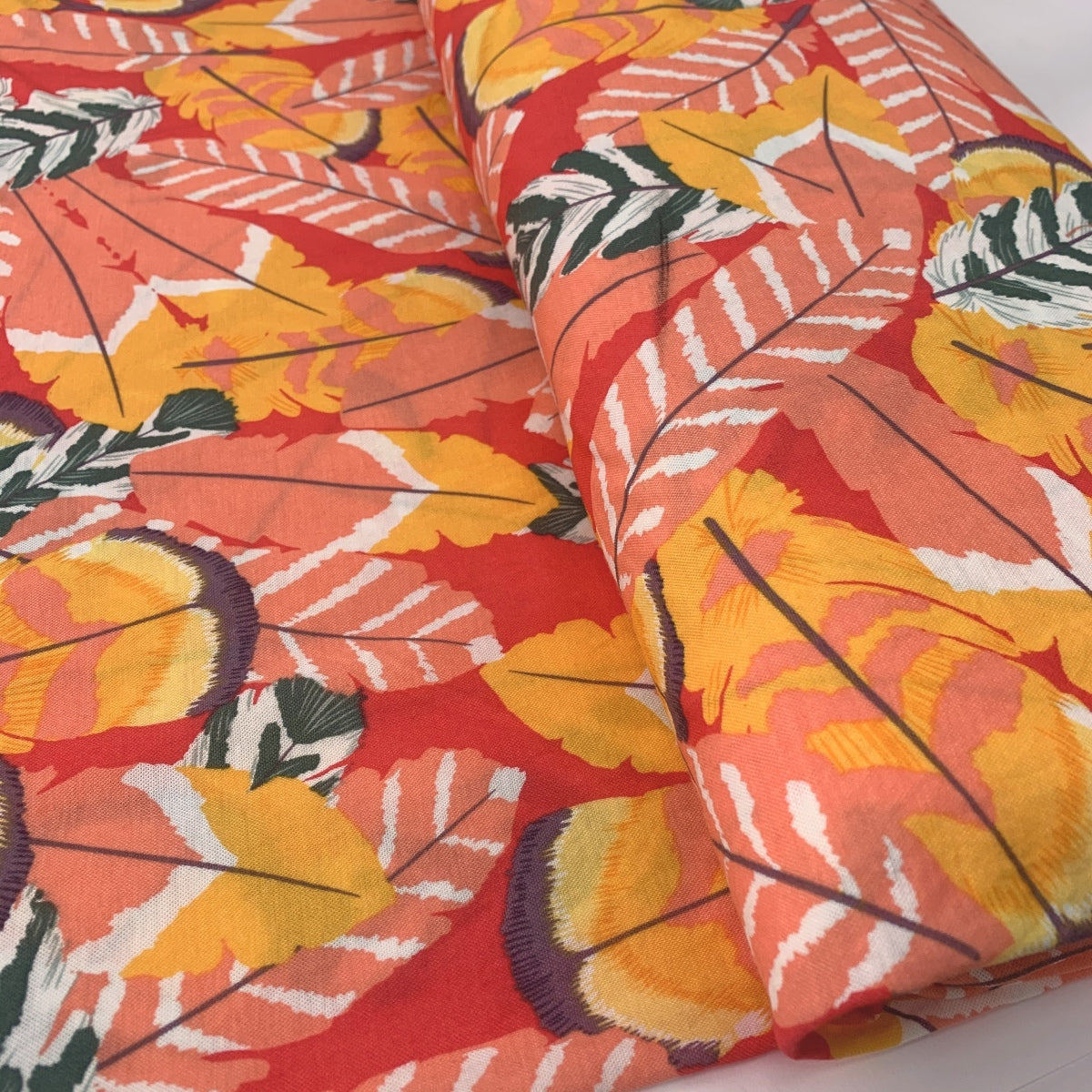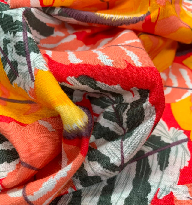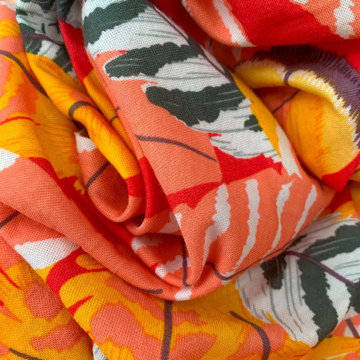 | Viscose and nylon knitted pique in a fantastic large-scale colourful feather print in coral and ochre. This jersey has a beautiful hand and drapes beautifully. It has the look of a jersey you would find in a polo shirt so there is something a little bit casual looking about it. This is a much finer knit than that though. We’ve not had anything like this at Croft Mill in a very long time. This is really rather delightful. | |