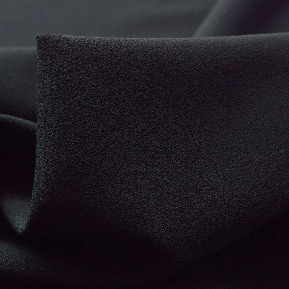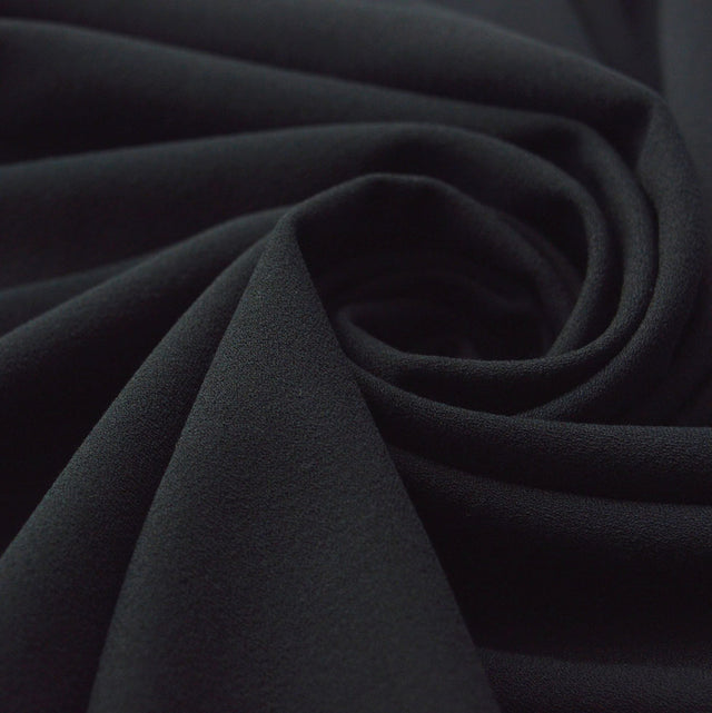 150cm wide, dark black 73% polyester 19% viscose, 8% Spandex beautifully finely knitted crepe suiting for any occasion.
