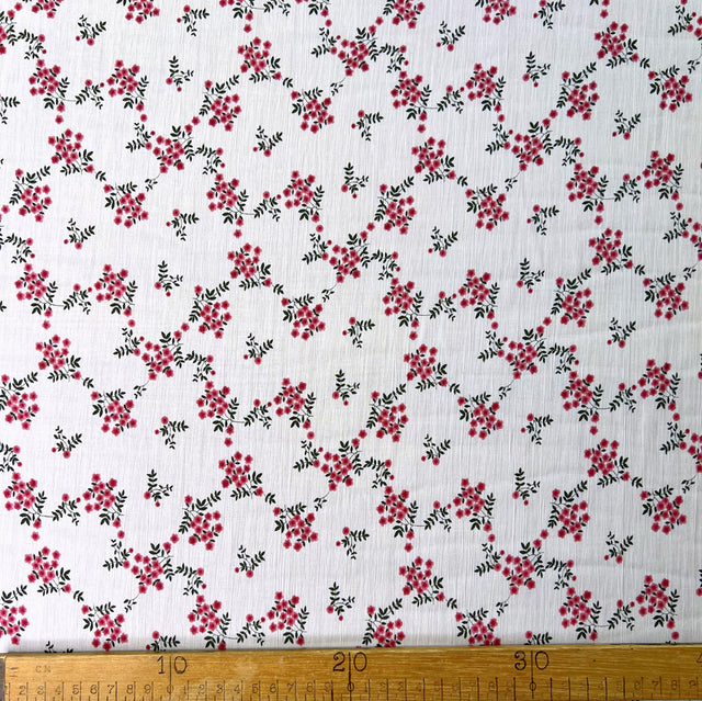 Featuring a delicate floral/leaf print in pink and green on a pale ivory ground, this fabric boasts a subtle textured barely pleated viscose lawn that gracefully drapes. The breathability of this fabric makes it a fab choice for creating stylish summer dresses, blouses, and skirts.