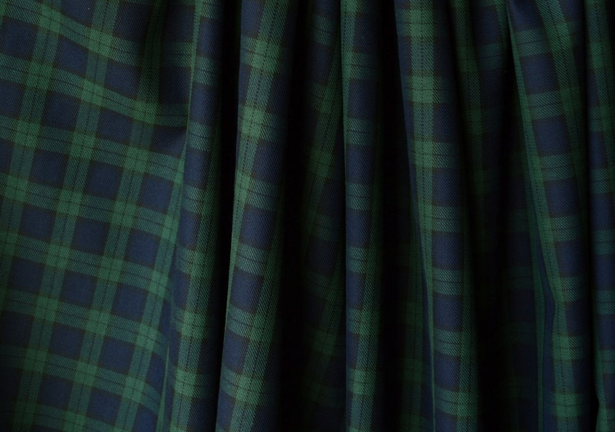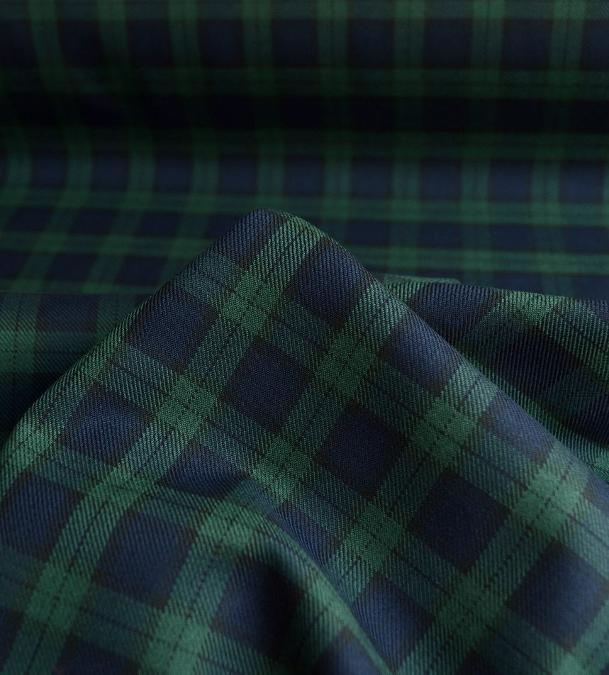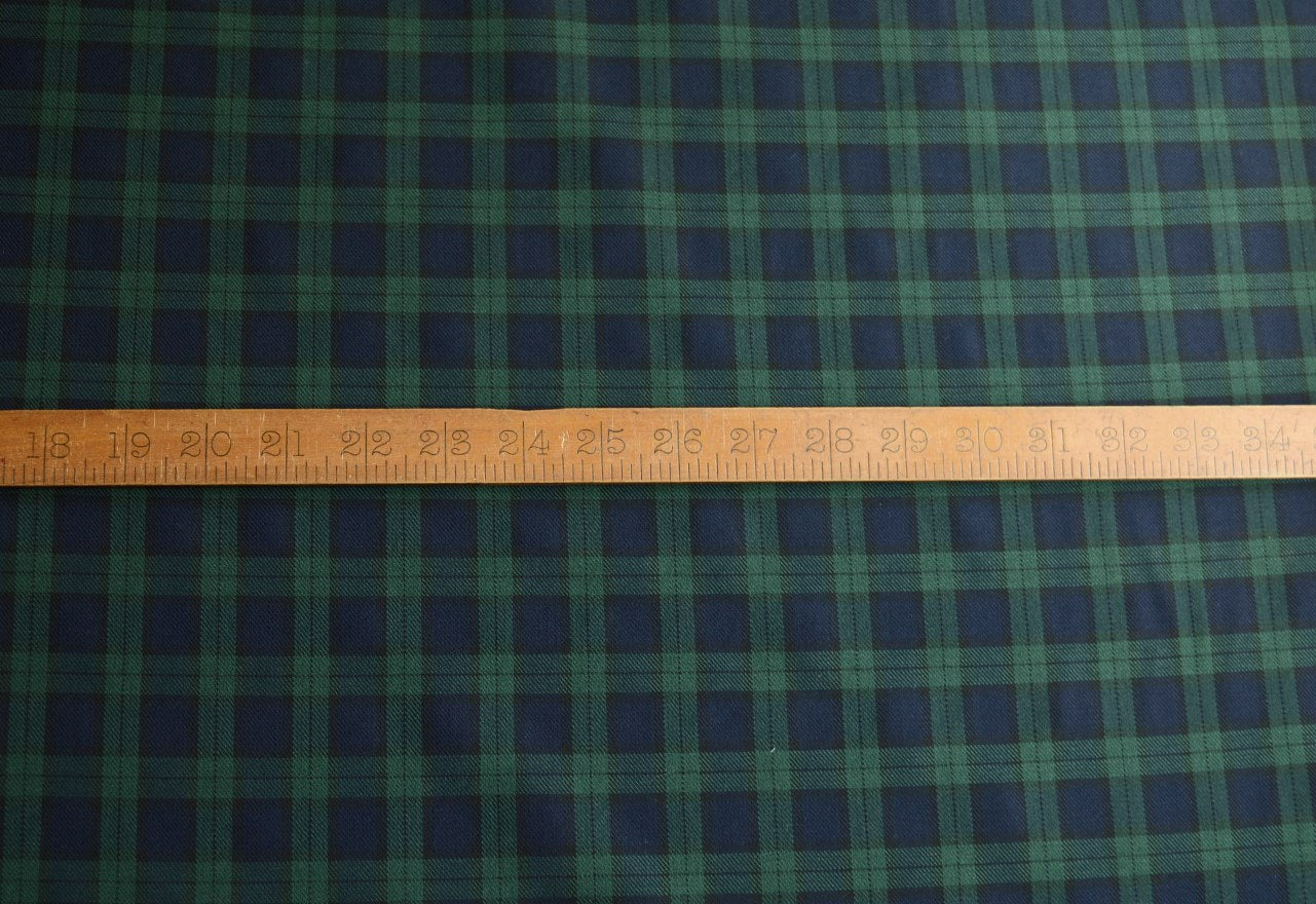 150cm wide good quality poly viscose lightweight suiting in a navy blue and green plaid., an extremely attractive and reasonably subtle pattern. Golfing trousers spring to mind!
