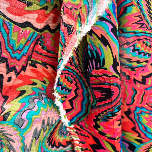 Made from a delicate blend of 52% rayon and 48% cotton, our printed voile fabric features an all-over abstract psychedelic design made up of a rainbow of colours in a mostly red hue. Our lightweight and airy cloth has a breathable nature allowing you to feel cool on warmer days.