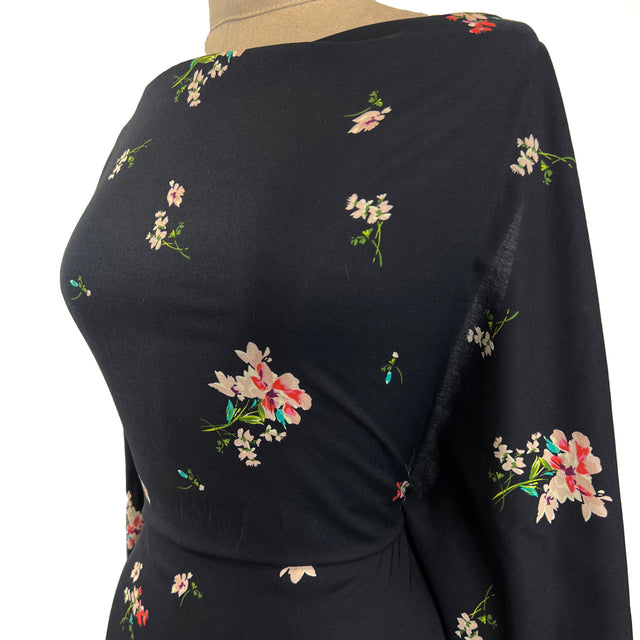 145cm wide, soft, black, beautiful viscose, German fabric with a sparse but all over floral print in pinks, pale aqua marine, mustard, olive, cream, purple and a little bit of almost white. The flowers are mostly arranged in sprays but there are an odd number of individual ones as well. Another very pretty, lovely quality fabric.