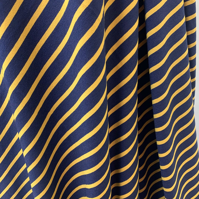| A fabulous quality four way stretch navy blue soft viscose/ elastane jersey with a ochre striped pattern. Great for a long wrap dress. And lots more besides Lovely and soft and drapes beautifully. | |