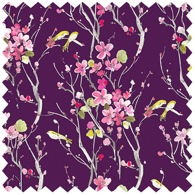 The Voyage cotton poplin fabric is slightly heavier than a standard poplin at 130 gsm with a 205 thread count. The beautiful design features blossoming flowers amongst characterful birds in an array of colours such as purple, pink, green and yellow. Reminiscent of Japanese ink drawings.