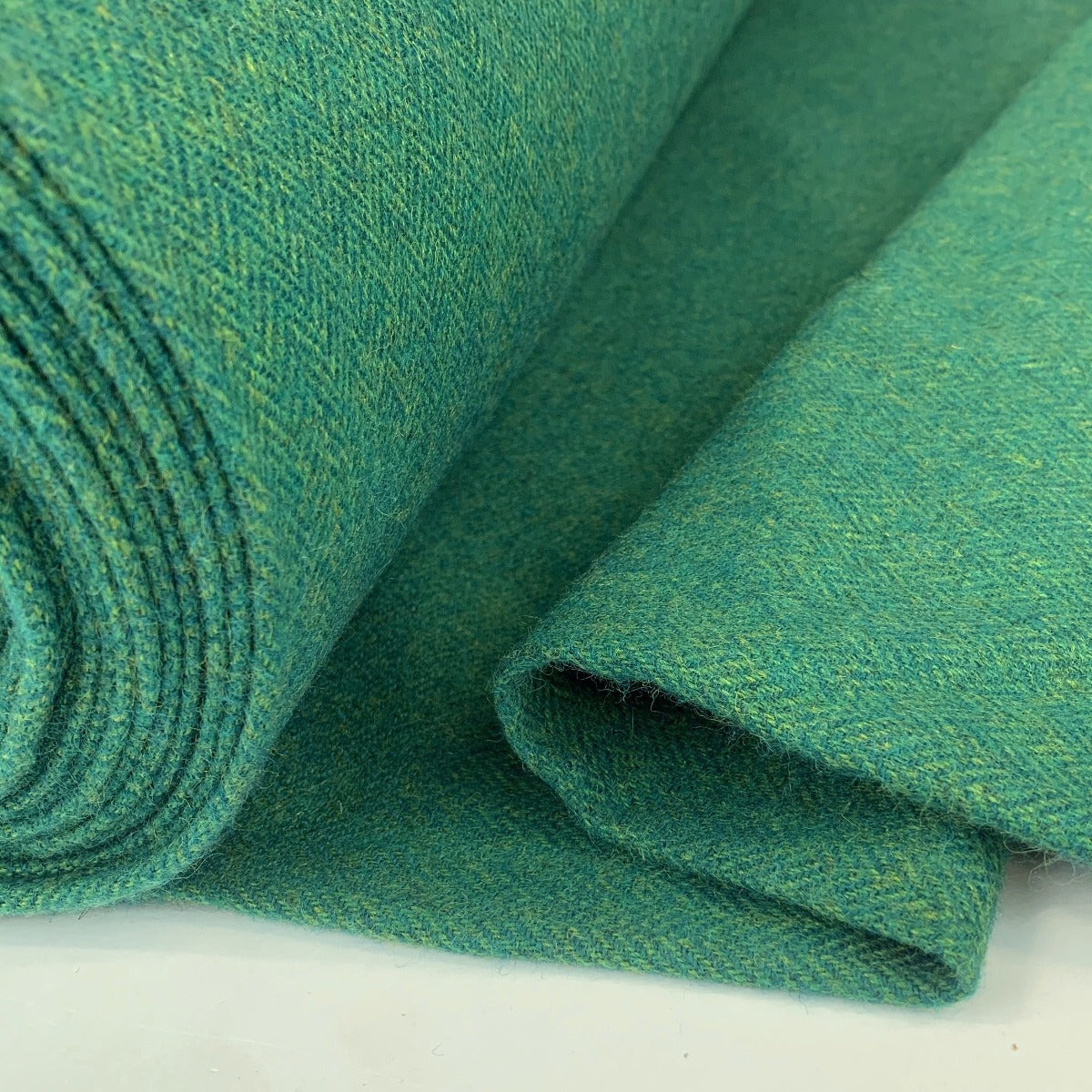A lightweight wool mix herringbone weave tweed material in Sherwood green comprising of emerald green and lime yarns. Maid Marion may well have had a cape made from something like this.