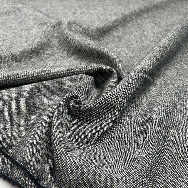 Black and grey wool tweed with soft handle and easy drape for tailoring.