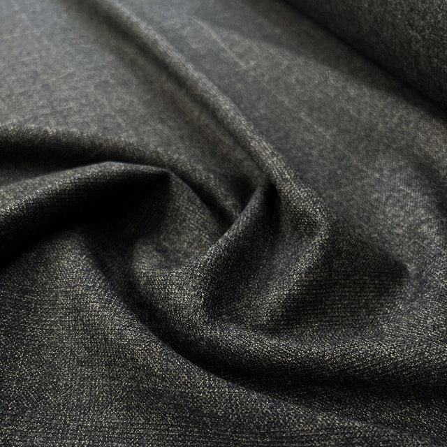 A luxurious, 150cm wide, finely woven 74% wool and 26% polyester suiting fabric. This refined cloth is crafted in a rich melange of black, grey, beige, and olive green yarns, creating a sophisticated depth of colour. A subtle white overcheck is cleverly woven into the fabric—almost hidden at first glance—adding quiet detail to a timeless design.