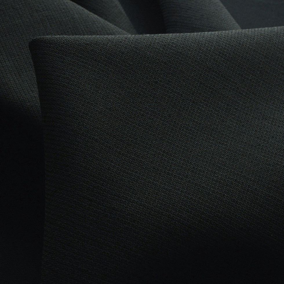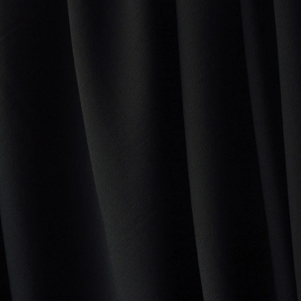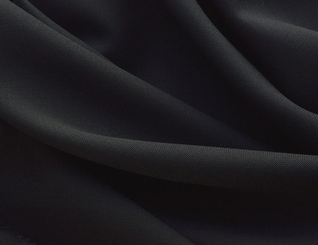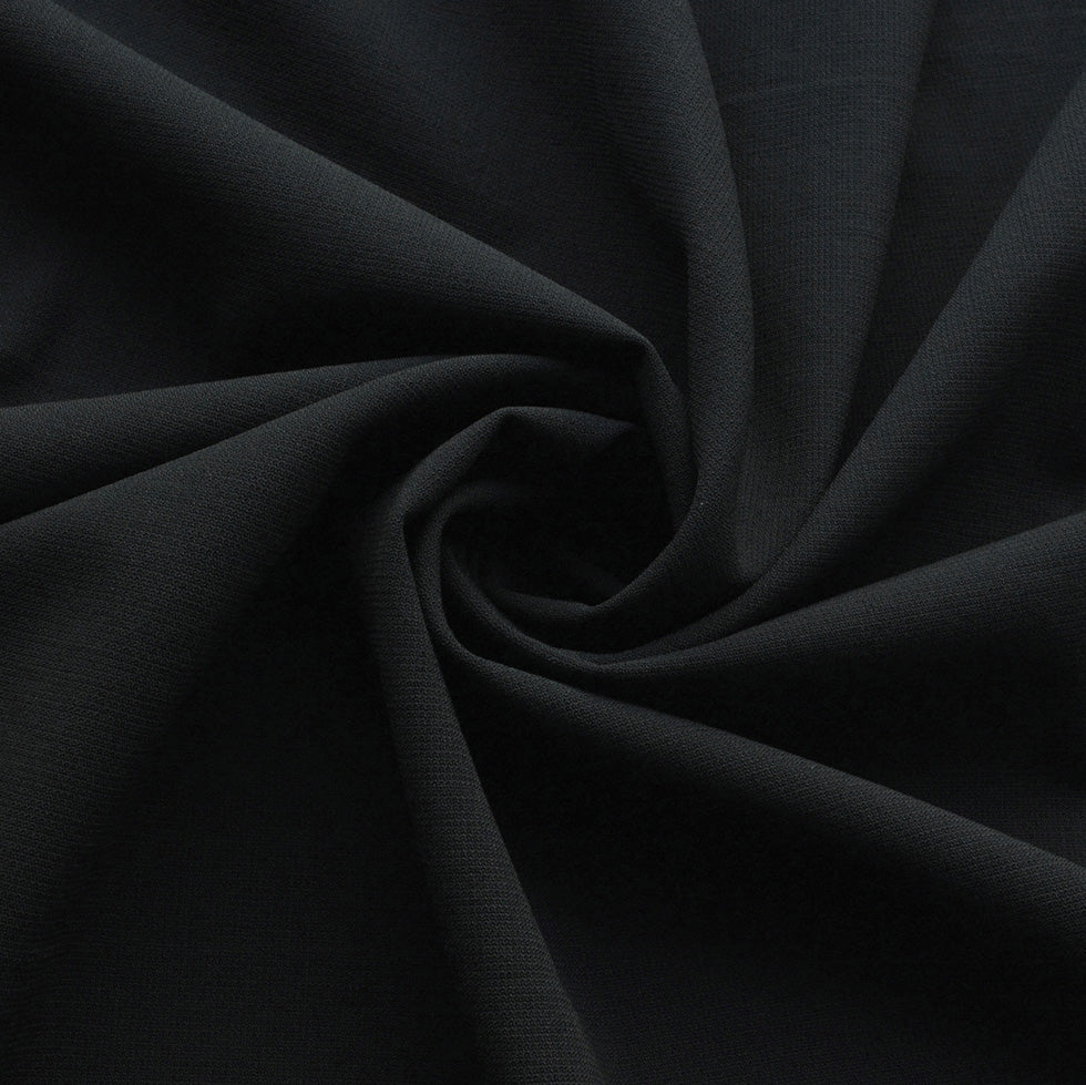 150cm wide black wool with polyester light weight suiting, woven pretty much like a fine loose hopsack, so that it has a little bit of coarseness about it. Drapes and falls beautifully and good to wear at any time of year.