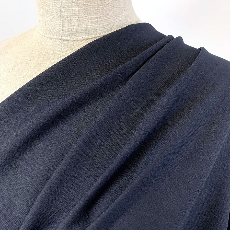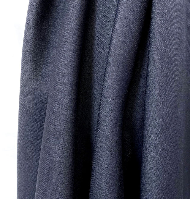 Finest wool/elastane suiting in dark navy. Good weight and lovely finish, and faintest stripe.