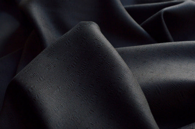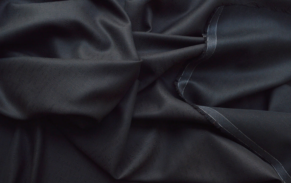 158 cm wide, Italian black all wool suiting with tiny little self-coloured markings in the weave. Made up of black and brown yarns, the reverse of this cloth looks black and the face dark brown.