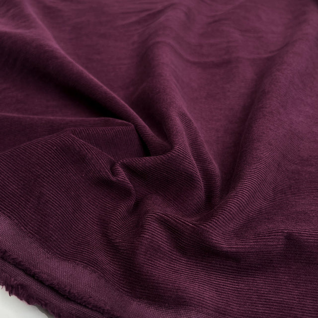 147cm wide, 100% cotton 16 wale washed corduroy fabric in dark wine. Midweight at 220–230gsm and Oeko-Tex Standard certified. Soft, durable, and beautifully textured, this washed corduroy has a relaxed, lived-in feel and is perfect for timeless wardrobe staples with comfort and structure.
