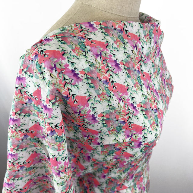 A lovely pink, 148cm wide, cotton lawn fabric featuring a delicate floral design with hints of purples and greens.