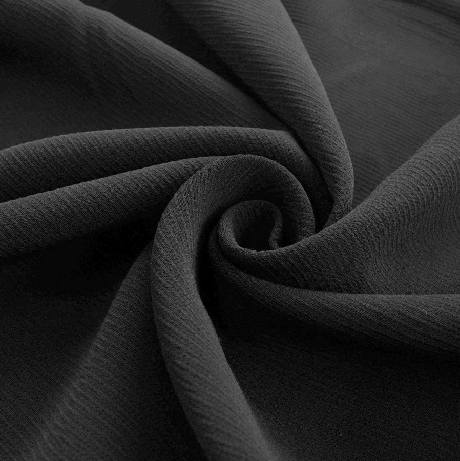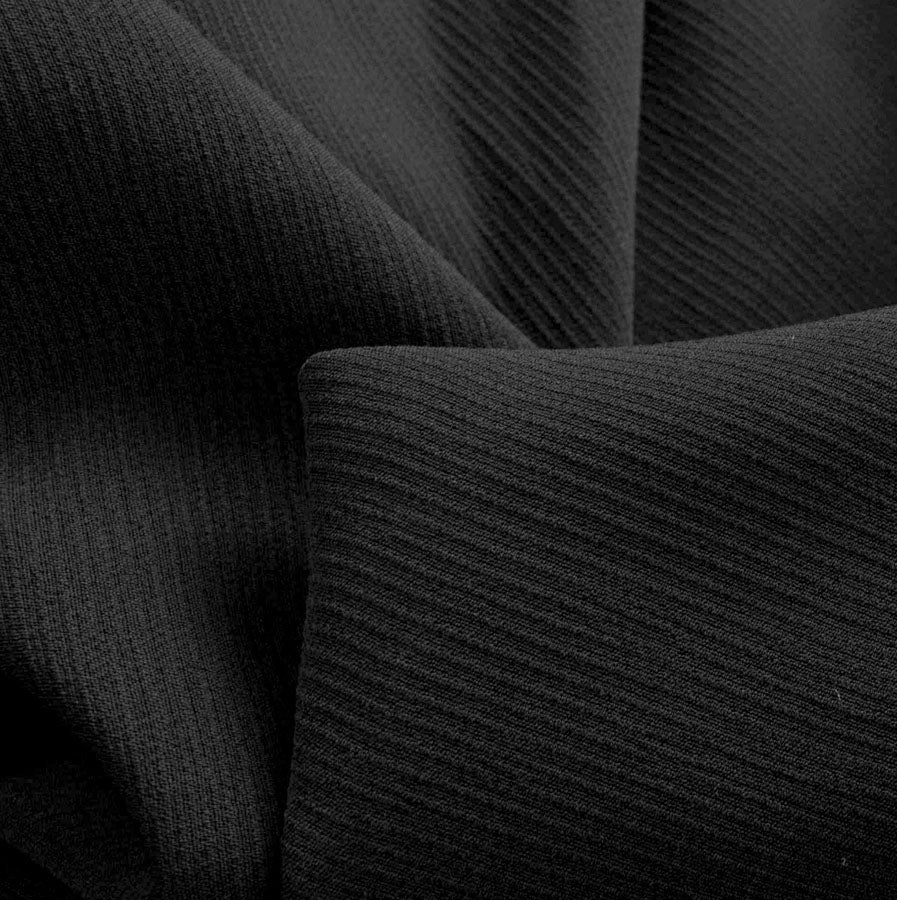 | Black 98% Polyester 2% elastane crepe with a positive and indeed visible fine ribbed pattern. great for trousers & jackets. | |