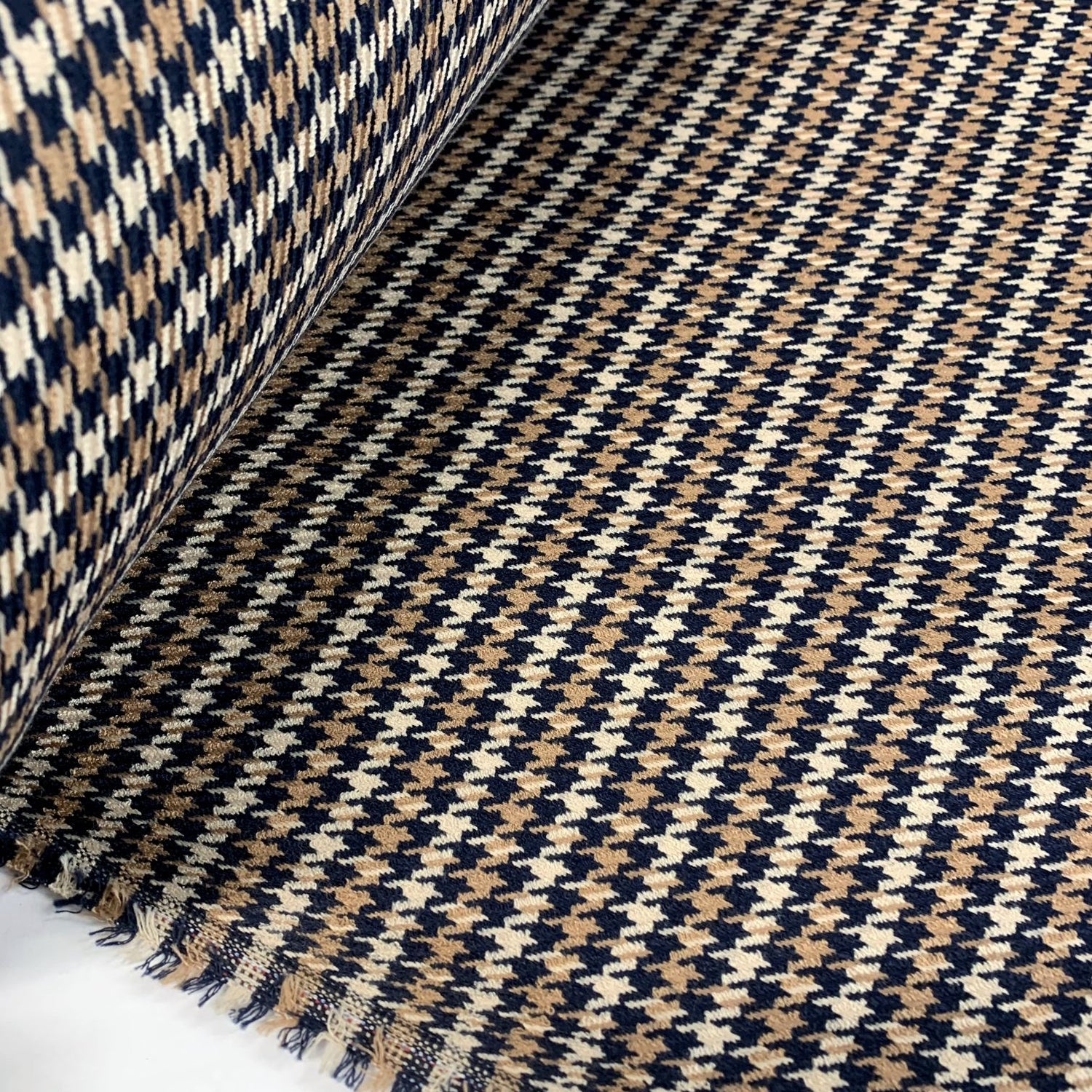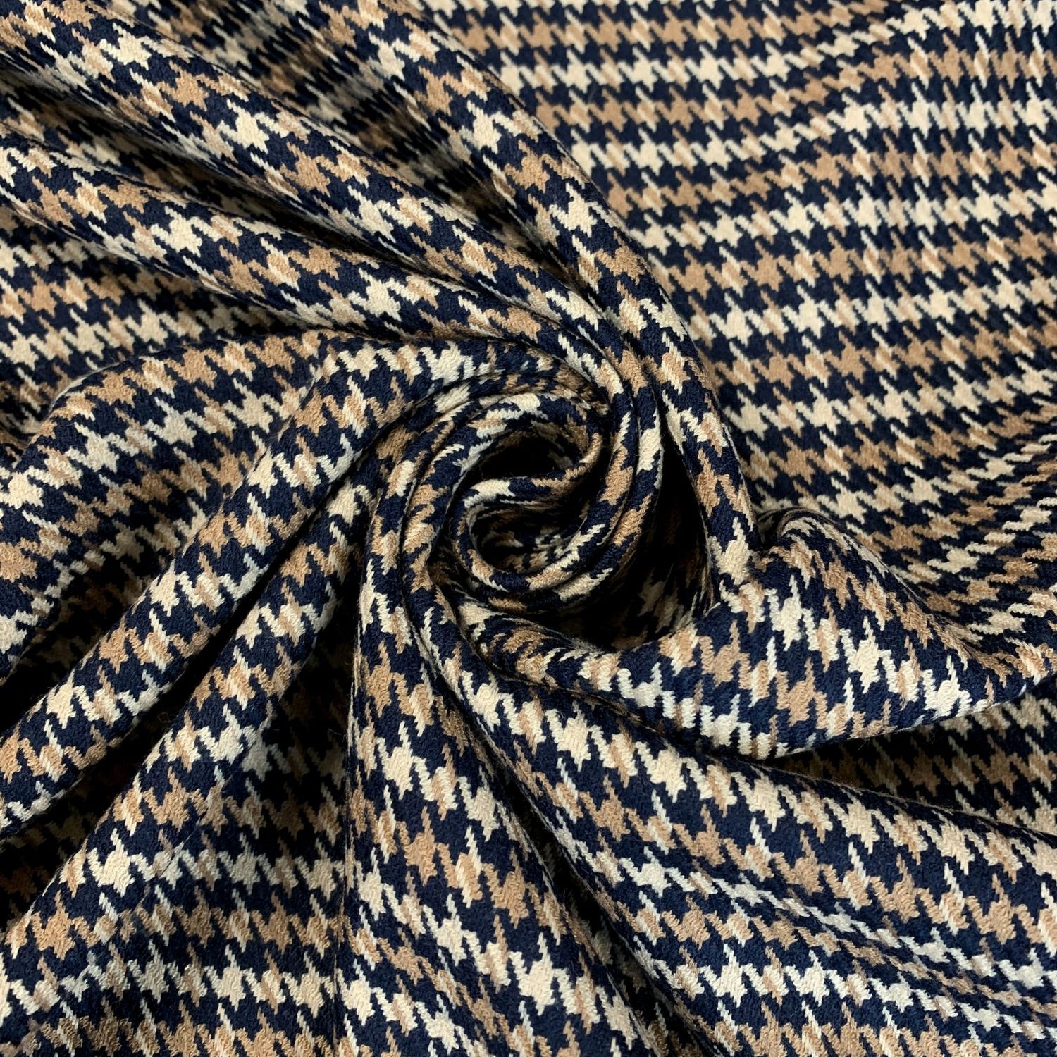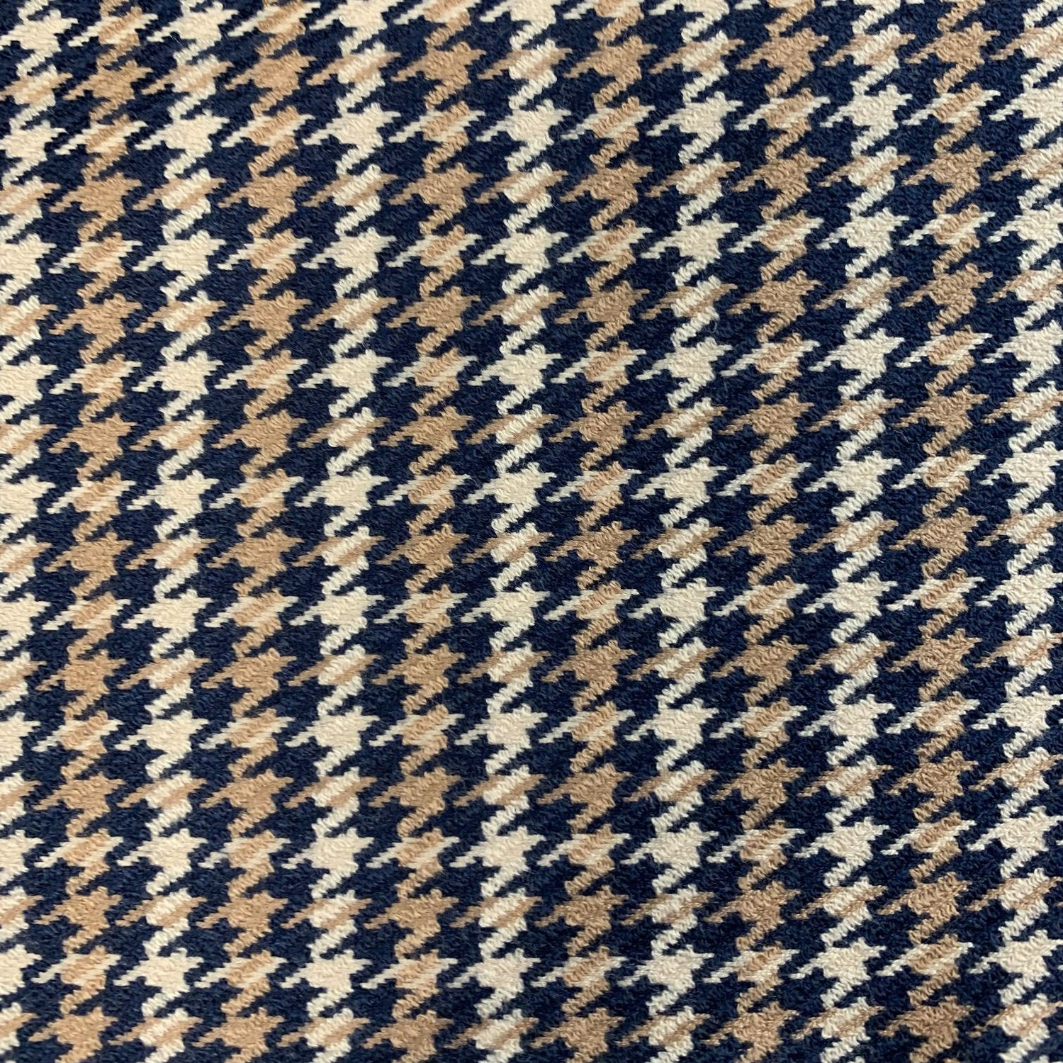 150cm wide soft polyester suiting in a small houndtooth check, made up of beige brown and navy yarns. This is ideal for an easy care & smart jacket.