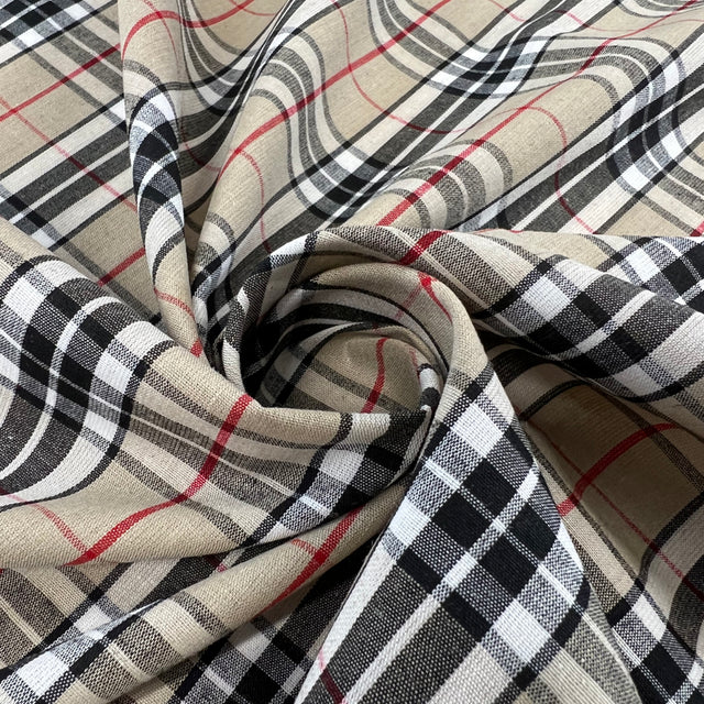 Our 146cm wide check poly/cotton shirting fabric in beige is excellent for crafts, dressmaking and tops!