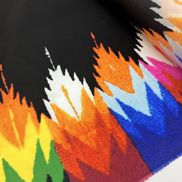 Introducing our captivating waterproof PU coated polyester fabric in sleek black, adorned with a vibrant leaf/flame print along one selvedge. This fabric is a true masterpiece, perfect for creating eye-catching ponchos, outerwear, coverings, and more.