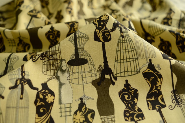 | 112cm wide Sew Vintage Cotton Fabric By Bristol Bay studio. This design is made up of Vintage Mannequins With Golden Detailing. A beautifully Detailed fabric with a sophisticated colour pallet. |