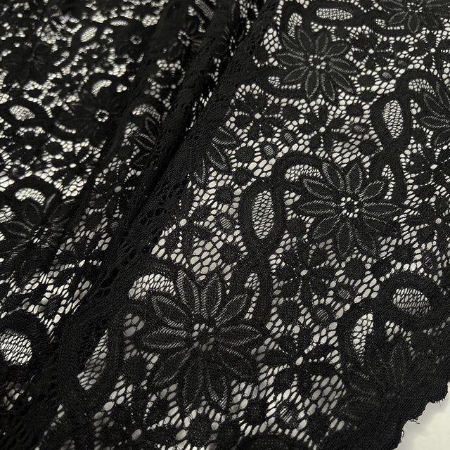 A black stretch lace with a dense, floral pattern and an open, lacey structure that gives it plenty of visual impact. The design is bold and detailed rather than delicate, with strong motifs that stand out clearly against the skin or a contrast lining. Despite the intricate patterning, the fabric remains soft and flexible, with a smooth handle that feels comfortable rather than scratchy.