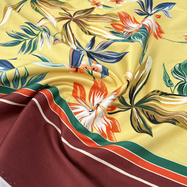 A stunning 142cm wide lightweight satin dress fabric made from 96% cotton and 4% elastane, printed with a vibrant South Pacific-inspired floral design. This rich yellow base is brought to life with large expressive blooms in green, blue, orange, mustard, and deep rust. A beautifully designed 15cm border runs along one selvedge, featuring a narrow green and orange stripe and a bold rust panel.