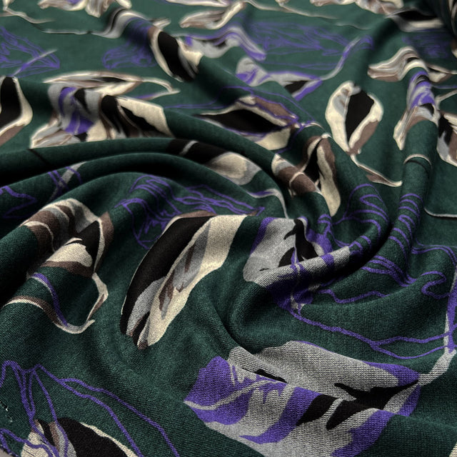 This viscose Ponte Roma fabric features a deep bottle green base with an all-over floral leaf design in black, grey, and purple tones. The print has a strong, graphic feel, while the smooth Ponte surface keeps the fabric polished and easy to wear.