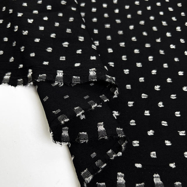 Elegant with a modern twist, this black chiffon fabric features delicate white stitched rectangular details that add subtle texture and interest. Made from a blend of 60% polyester and 40% nylon, it has a slightly heavier weight than traditional chiffon, giving it a graceful drape with a touch more structure. At 150cm wide and 162gsm, it’s perfect for blouses, dresses, overlays, and eveningwear that call for refined movement and understated detail.