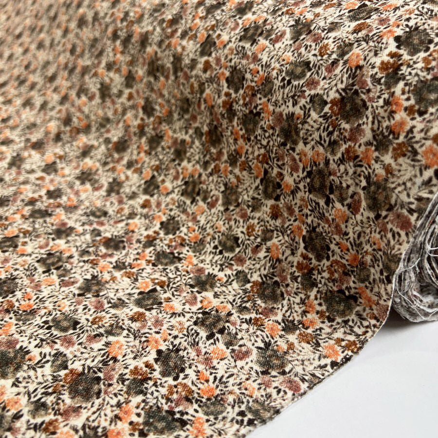 Soft, warm, and full of charm — this 100% cotton brushed fabric features a delicate peach, brown, and olive floral print on a cream background. With its cosy brushed texture and breathable handle, it’s ideal for comfortable makes that feel as good as they look. At 148cm wide and 122gsm, this lightweight cotton is perfect for pyjamas, nightdresses, shirts, and soft home projects.