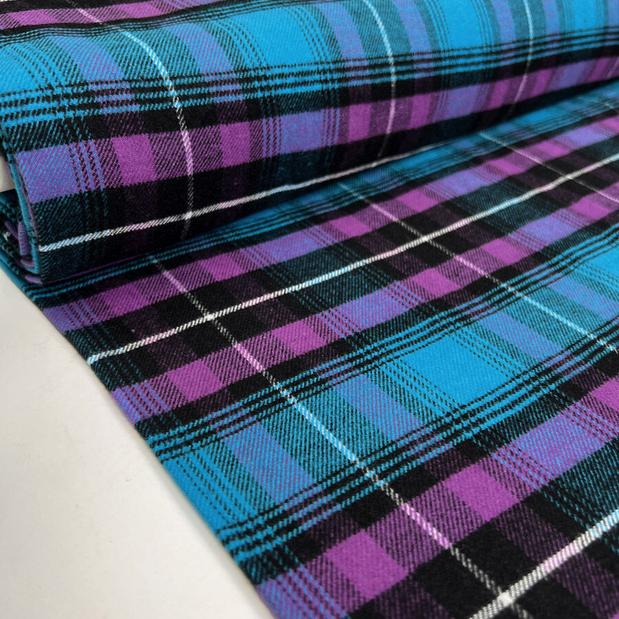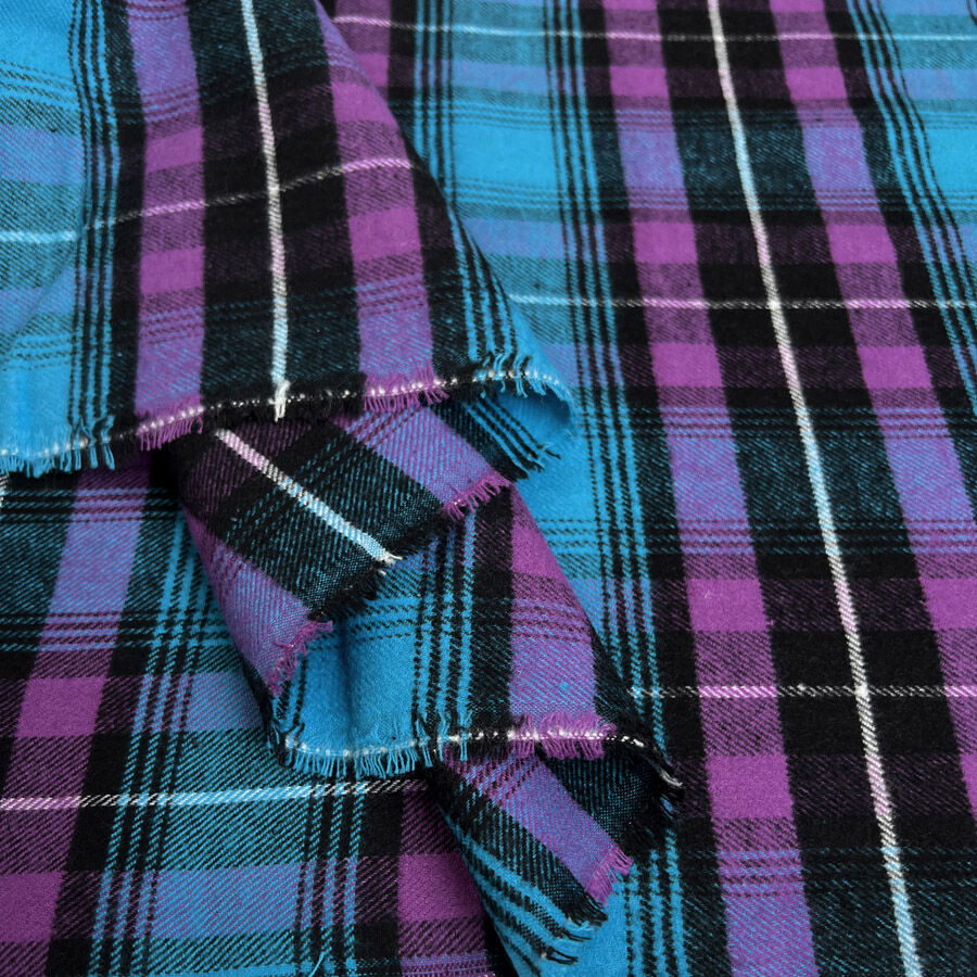 Soft, cosy, and full of personality, this turquoise, purple, and black brushed cotton check fabric is perfect for creating comfortable everyday garments. Woven from cotton and brushed for extra softness, it feels warm and gentle against the skin while remaining breathable and easy to work with. At 144cm wide and 140gsm, it’s ideal for shirts, pyjamas, dresses, and childrenswear. Certified to OEKO-Tex Standard 100, it’s a safe, sustainable, and stylish choice.