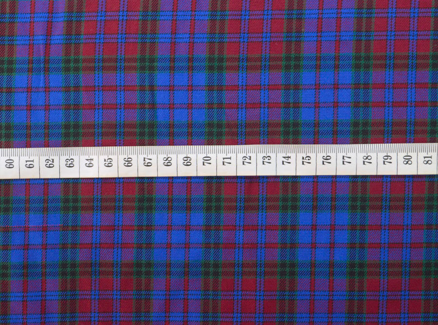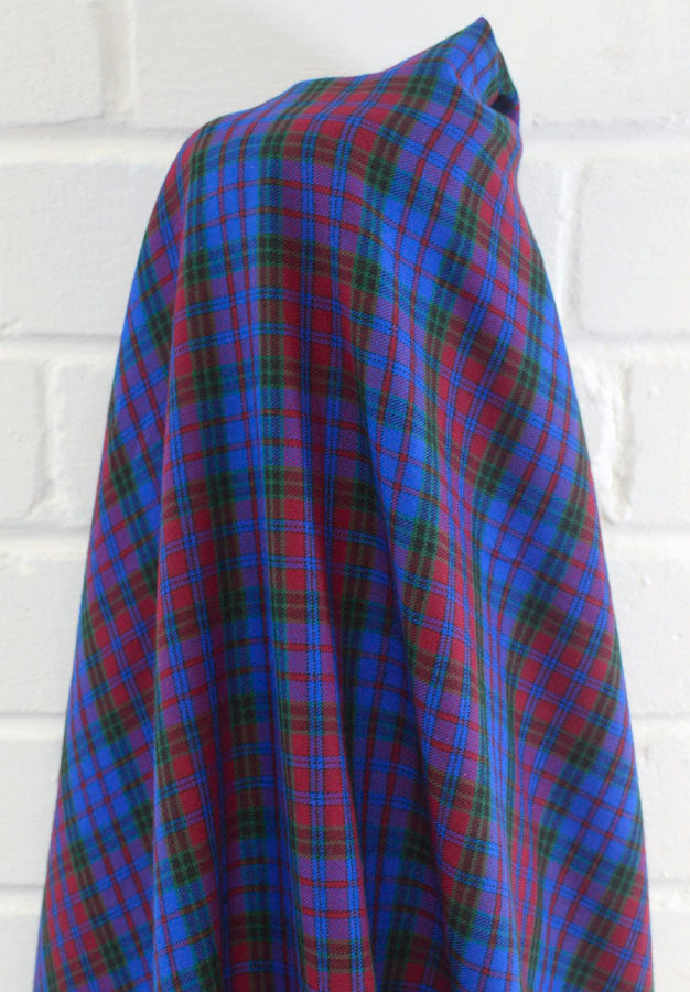 Brushed cotton tartan shirting fabric in bright royal blue, red, green and black check. The colours in this cloth are truly captivating.