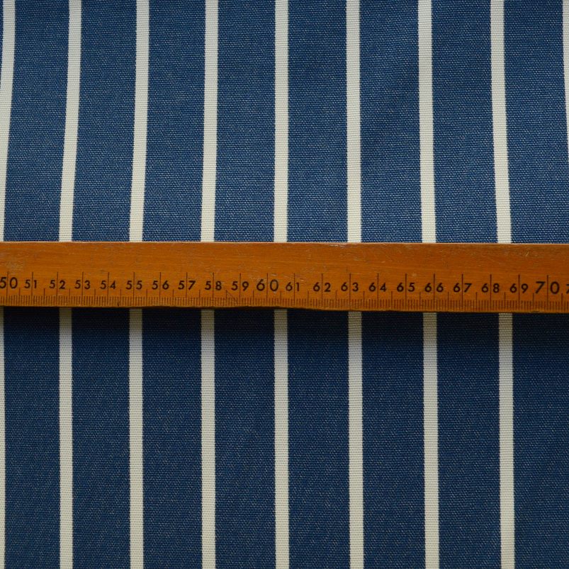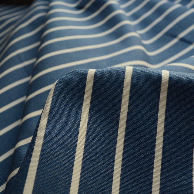 | A 155cm wide quite substantial cotton canvas in a French navy and off white stripe. The navy part of the stripe being about 2cm wide and the white 5mm wide. It has a surprisingly soft hand, but it still is a cloth that will retain its structure. | |||