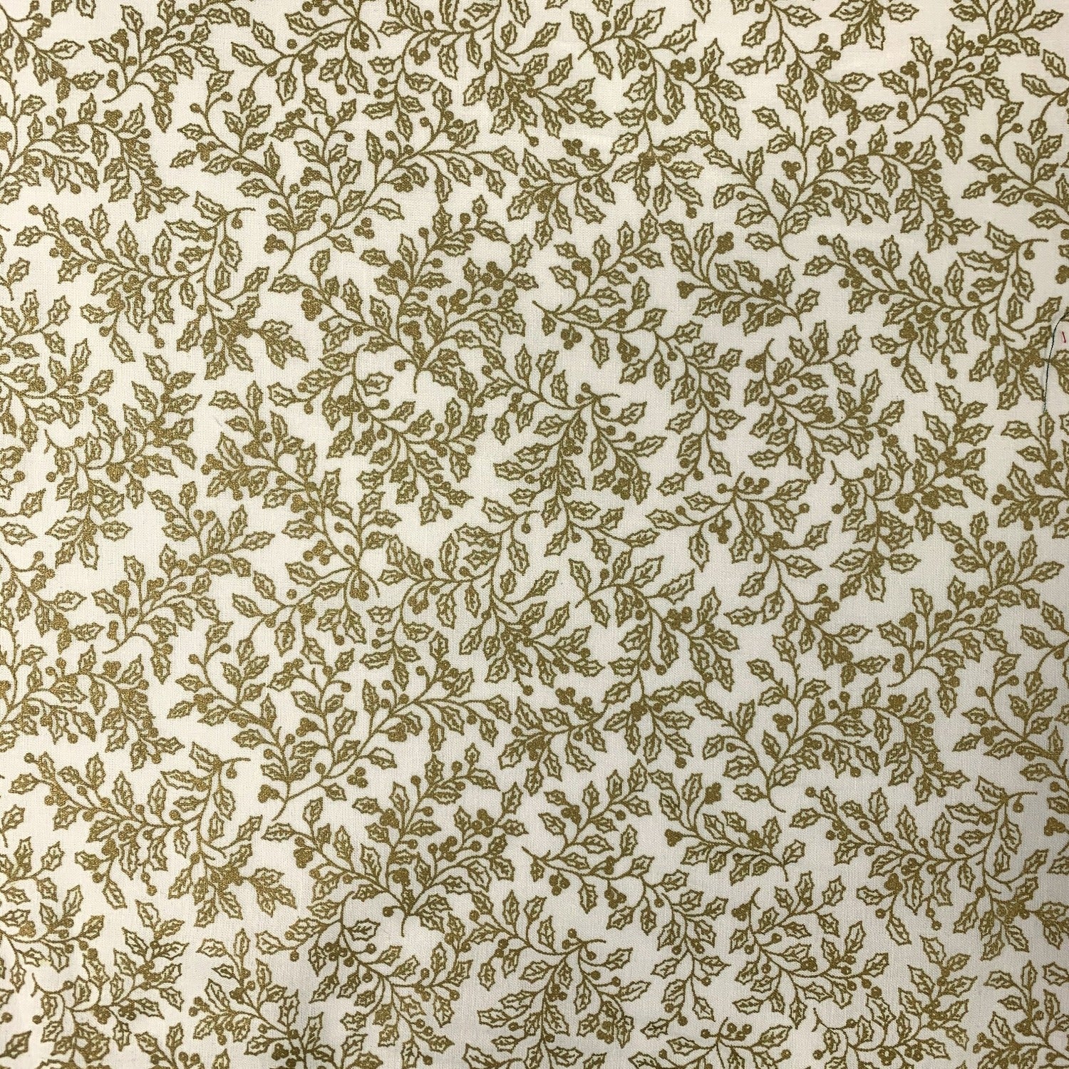 140cm wide good quality cotton poplin fabric with a 'christmasy' holly bush print in gold on an ivory ground. Good for Christmas decorations & crafts.