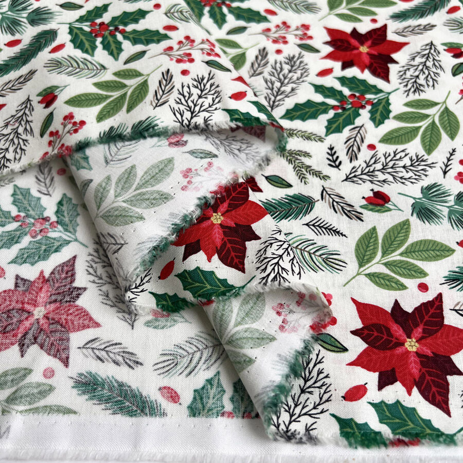 Celebrate the season with this 100% cotton Christmas fabric, featuring a charming festive design of red poinsettias, holly leaves, and winter foliage on a soft ivory background.