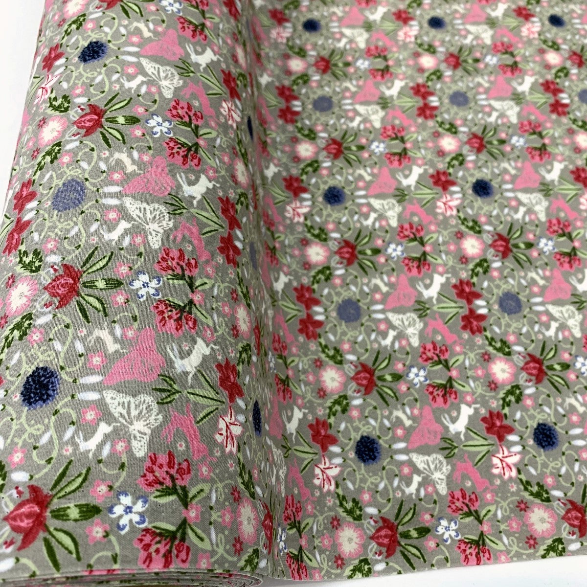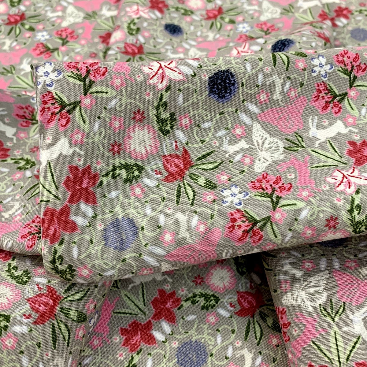 It comes in pale taupe/warm grey Easter print with butteflies and rabbits. Easy to sew and suitable for most dress patterns.