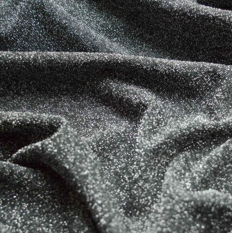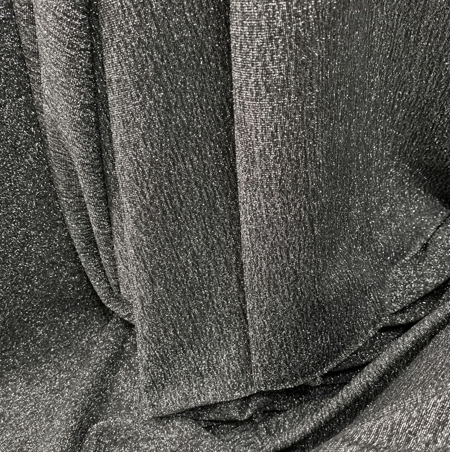 | 145cm wide, black polyester elastane jersey fabric with silver metallic yarn. Lightweight jersey for batwing and cowl neck tops and dresses worn with an underslip. You can pull and tug at this and the metallic yarn is stable and does not come away. | |