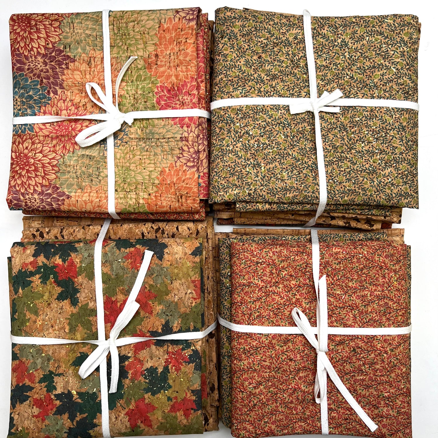 This cork fat quarter bundle contains a pack of 4, 50x65cm pieces, each with a mixed bunch design. Ideal for handbags or accessories!