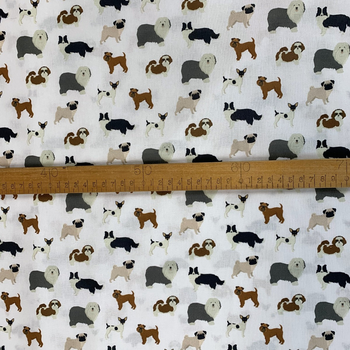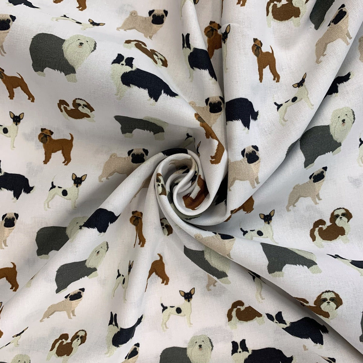 This gorgeous soft cotton dress and quilting fabric showcases a delightful design featuring a collection of charming dogs from various breeds, gracefully set against a soft white background.