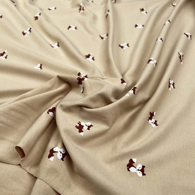 A soft cotton elastane jersey in a warm beige shade, printed with small scattered fox motifs. The print is neat and well-spaced, making it easy to cut and sew without pattern matching becoming a chore.