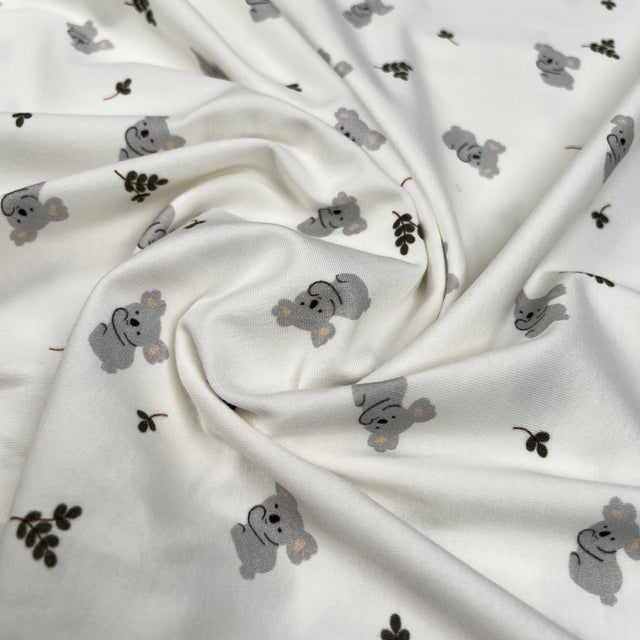 A soft cotton jersey printed with small grey koalas and scattered leafy sprigs on a warm cream background. The design is gentle and playful without being too busy, making it a good choice for everyday makes for little ones.