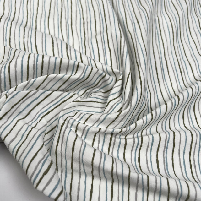 A soft and stretchy cotton jersey featuring narrow, irregular stripes in muted blue, green and grey on a cream base. The pattern is simple and easy to wear, with a relaxed, everyday feel that works across seasons.