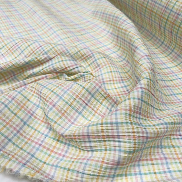 This "exclusive to Croft Mill" cotton seersucker features a soft pastel check in gentle shades of yellow, blue, green and pink, woven into a lightly puckered surface that gives it its characteristic texture. The seersucker weave lifts the fabric away from the skin, making it breathable and comfortable to wear, particularly in warmer weather.