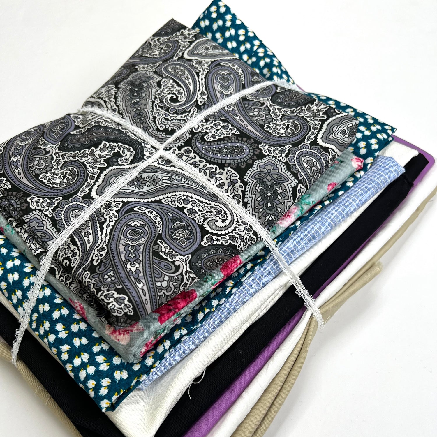 6m mixed bundle pack, 9 pieces of cotton, viscose and polyester fabric, ranging from 50cm to 90cm fabric pieces. Made up from deadstock fabrics, end of line cloths, and special one-off pieces.