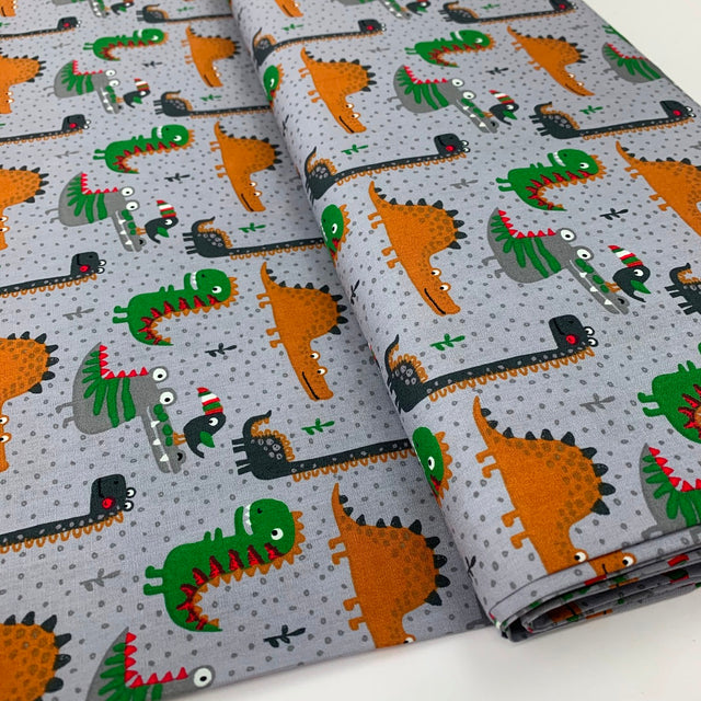 | Really cute cotton dinosaur print in grey, orche, navy and green. Printed in Europe, a great design for kids.